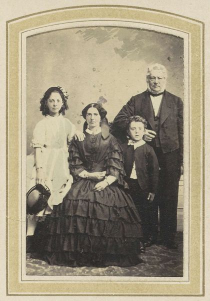 This is an undated portrait of a man, a baby, and two women by Carl Wilhelm Bauer, printed on carte-de-visite. The sepia tones and composition create a sense of formal austerity, typical of its time. Arranged against a dark backdrop, the subjects are rigidly posed; the man stands tall in a dark suit and the women are in elaborate dresses. The textural details, from the ruffles of the woman’s dress to the crispness of the white bonnets, are meticulously captured. This attention to detail reflects the conventions of 19th-century portraiture, where clarity and precision served to convey status and respectability. The photograph operates as a system of signs, where clothing, pose, and even the quality of the print contribute to constructing the social identities of the subjects. The photograph, in its structured composition and tonal range, tells a story of societal roles and familial bonds. It invites viewers to interpret the complex interplay of representation, identity, and the evolving technologies of image-making.