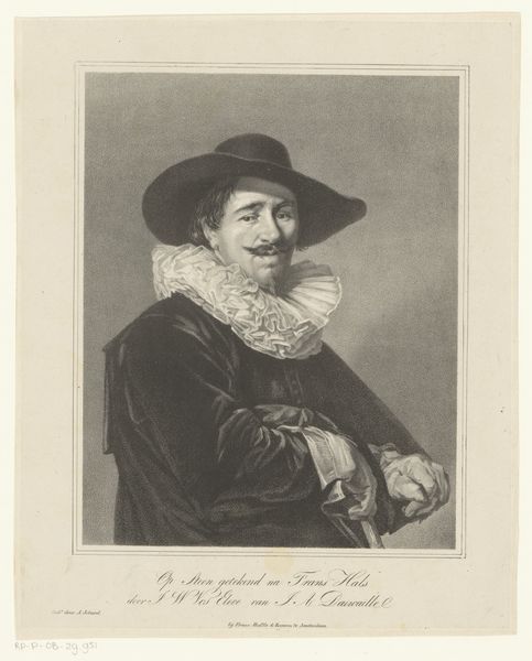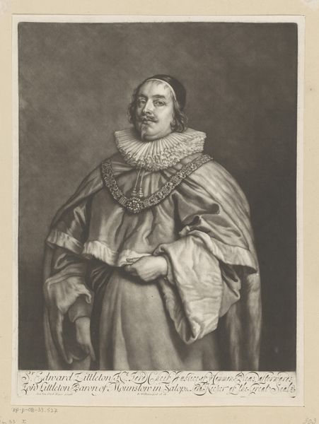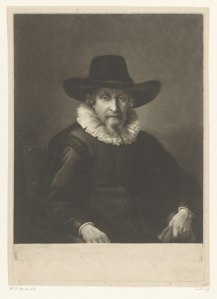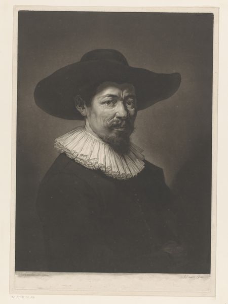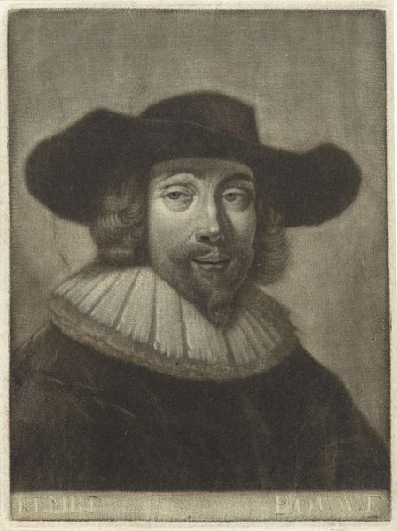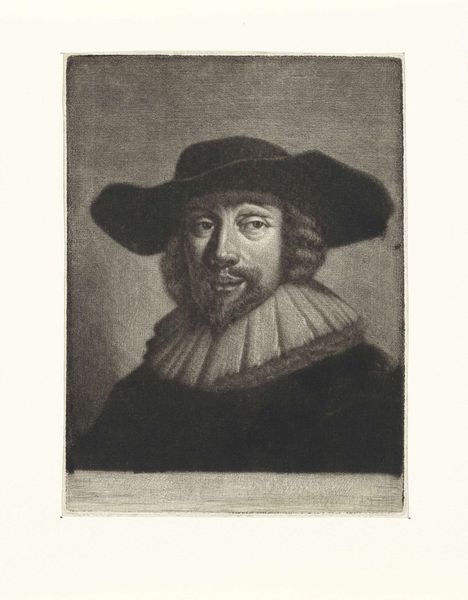 Editor: So here we have "Portrait of an unknown man with a pleated collar and hat," dating from somewhere between 1731 and 1775, made by Richard Houston. It's an engraving. I’m struck by how much the details in the ruff stand out; it looks almost like a separate object. What are your thoughts when you look at this, Professor? Curator: The first thing I notice is the medium itself. Engraving allowed for relatively mass production of images. How does that change our understanding of portraiture during this period? Was it about commemorating the sitter or about circulating an idea of status, even fabricating it, considering it is an unknown man? The material reality of the print – the paper, the ink, the very labor involved in its creation and distribution – is what interests me here. Editor: That's a fascinating point. So, the availability of prints democratized art in some way? But did that accessibility affect the perceived value, either for the sitter or for the patrons who might purchase these engravings? Curator: Exactly. Think about the contrast between this relatively affordable print and a unique, commissioned oil painting of the time. Both served to represent identity and perhaps status, but their materials and production involved different layers of exclusivity and different audiences. Did the act of engraving challenge those rigid categories of fine art by blurring the boundaries of portraiture, making it a commodity, or did it in some ways add a new facet of refinement? Editor: I never considered it like that. It almost seems subversive. I guess I’d just thought of engravings as cheaper versions of paintings. Curator: That’s a very good initial understanding. Consider the labor, the dissemination, and ultimately the accessibility in terms of social implications, and you’ll start to reconsider where you’re placing artistic and financial value. Editor: Thank you. That's a really interesting material perspective to take on a portrait!
