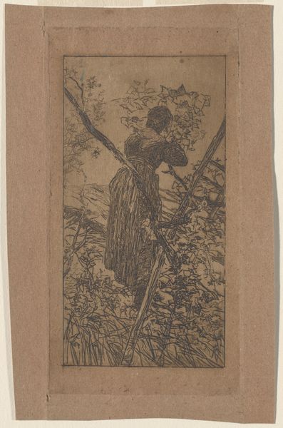 Editor: Here we have "The Maiden Gazes O'er the Wall..." from 1889, part of the Magic Changing Cards series by Kinney Tobacco Company. It's a small print, and it makes me think of old-fashioned longing or maybe even a bit of forbidden curiosity. What strikes you most when you look at it? Curator: I'm fascinated by how it evokes a very particular kind of feminine yearning. Consider the wall itself – a boundary, a separation. What does it mean when we depict a woman perpetually looking beyond those limits? What possibilities lie outside her grasp? This wall symbolizes limitations placed upon women, reflecting broader social structures and expectations of the time. The visual narrative blends the real and the symbolic, which resonates deeply within our collective memory. Editor: That makes me think about the poem at the bottom, and the bit about finding something that rhymes with “bliss.” It’s not just a literal looking; it’s also a search. Curator: Exactly. That longing for "bliss," juxtaposed with the visual barrier, tells us much about idealized womanhood, societal restrictions, and the very human desire to transcend those limits. And have you noticed how the act of holding it to the light is a revealing act, showing a desire for transparency? Editor: I hadn't thought of the phrase "hold to the light" as symbolic, but it makes perfect sense that this promotional print hints at revelation and secret knowledge! Curator: It highlights a narrative of restrained desire, a potent image woven from both ink and cultural context. These subtle yet pervasive visual and textual cues reflect not only aesthetic trends but the undercurrents of a society in transition. Editor: It’s incredible how much depth there is in something so small! Thank you. Curator: My pleasure; these fleeting images remind us that even the smallest of cultural objects hold worlds within them.