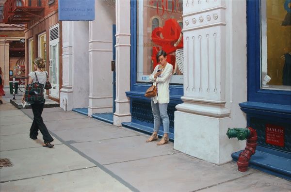 Curator: Here we have Nigel Van Wieck’s acrylic painting titled, "Inside Out". Editor: My first thought? Urban voyeurism with a touch of melancholy, like a Hopper painting through a contemporary lens. That window, that frame… Curator: Yes, the window acts as a proscenium arch, staging an intimate scene within a cityscape, doesn’t it? Think about the use of windows in art—revealing and concealing, alluding to psychological boundaries. Editor: Absolutely. The people inside seem so self-contained, unaware of the observer – us, presumably – which heightens the sense of alienation. And yet there's a compelling sense of connection – that muted drama pulling us closer. It's intriguing, this inside/outside tension, amplified by that stark lighting and what look like reflections? Curator: Indeed. That duality is a hallmark of figurative painting engaging with the urban landscape; here, it's emphasized through color choices— the muted, earthy tones outside against the slightly heightened reds and blues within the interior. Van Wieck explores the idea of looking beyond a facade. The graffiti-art and street art tag also suggest how boundaries and identities intersect. Editor: Facades, absolutely! You know, I find myself wondering about the unseen narratives here. The champagne glasses on the tray-- celebration or awkward gathering? That figure outside in the bottom of the frame—lost or invisible to the scene inside? All these micro-stories buzzing, creating this wonderful open-ended narrative. And that muted color palette lends this such an old world almost wistful aura, too. Curator: And the window becomes a key structural device here; it's about memory and about liminality, how we pass through public and private lives... and what gets left on the windowpane. Van Wieck manages to touch something familiar while letting so much remain unspoken. Editor: It is lovely—evokes a moment frozen but humming with unrealized connections. "Inside Out"-- quite a smart title.
