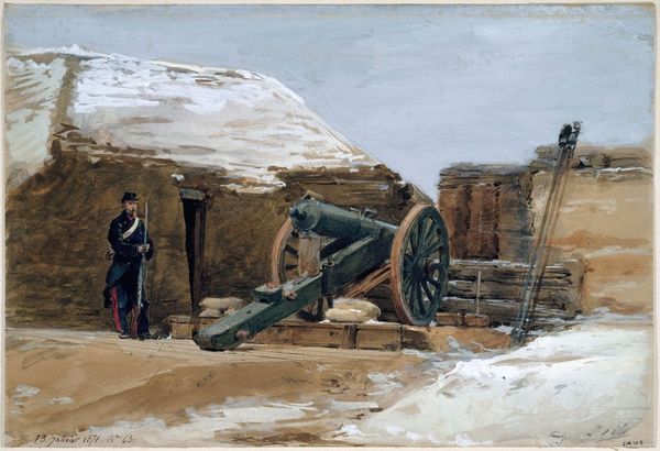 Curator: Isidore Pils's "Les Buttes-Chaumont", created in 1871 using mixed media and watercolor, depicts a rather somber scene. Editor: It evokes an immediate sense of desolation. The muted tones and stark arrangement of cannons create a visual language of abandonment, wouldn't you agree? Curator: Absolutely. The composition is built upon horizontal lines established by the cannons themselves and reinforced by the subtle gradation of the sky. It provides structure, but a bleak structure indeed. Notice the artist's choice to keep the horizon so low in the picture plane? Editor: And within that structure, consider the symbolic weight of these artillery pieces. Cannons often represent power and destruction, of course, but placed in such a barren landscape, they speak to a more specific, painful kind of loss. This was painted shortly after the Franco-Prussian War, a time of great national trauma for France. Curator: Yes, context is key. The landscape genre here isn’t just picturesque; it acts as a vehicle for national mourning. Pils meticulously renders the textures of earth and metal. This almost documentary approach heightens the emotional impact. Editor: It’s in these textures and muted palette that Pils locates an elegiac tone. The cannons, rendered with meticulous detail, aren’t merely objects; they stand as a metaphor for national vulnerability and the trauma inflicted on both landscape and psyche. Curator: Agreed. The somber colors underscore the emotional gravity. Pils uses variations of brown and gray, further intensifying the atmosphere. It creates this sensation of almost a 'wasteland', evoking a psychological feeling of dread and melancholia in the observer. Editor: Examining the semiotic landscape, these abandoned tools of war could then be viewed as symbolizing a transition or end-point for French Imperial power, hinting to its symbolic mortality by way of tangible obsolescence. Curator: Well said. This combination of form, material, and color constructs a powerful statement. Even the absence of figures in the foreground directs our attention to the heavy guns themselves, implying the deeper meaning of his message. Editor: Ultimately, what began as a simple-seeming landscape is actually heavy with meaning and historical association. Curator: I concur. This particular mixed media piece prompts reflections on the intrinsic qualities of a scene layered in history, offering insight into its enduring impact.