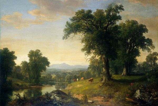 "Scene on the Catskill Creek, New York" is a painting by Frederic Edwin Church that presents a serene landscape bathed in the warm hues of either sunrise or sunset. The composition features a tranquil body of water reflecting the sky, framed by lush vegetation and rocky outcrops. Church employs light to create a sense of sublime beauty and contemplative stillness. The sky is rendered with soft, billowing clouds that capture and diffuse the sun's glow. The light interacts with the landscape, creating shadows and highlights that sculpt the forms of the trees and rocks. This interplay of light and shadow evokes a sense of depth and atmosphere, inviting viewers to immerse themselves in the scene. In this landscape, nature is depicted as both powerful and harmonious, a reflection of transcendentalist ideas prevalent during Church's time. The painting's meticulous detail and idealized representation invite viewers to contemplate the spiritual and emotional resonance of the natural world. Note how the artist balances the details of his natural forms with the larger context of the landscape. In this synthesis, Church invites us to meditate on our relationship with nature.
