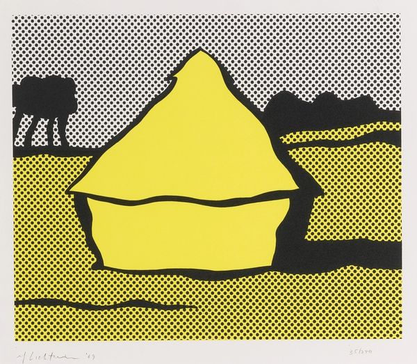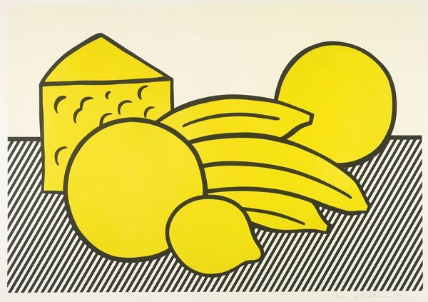 Editor: So, this is Roy Lichtenstein's "Baked Potato" from 1962. It's quite a stark image, the black and yellow really pop. What's immediately striking is its almost cartoonish simplicity. What do you see in this piece, beyond the literal? Curator: For me, it speaks to the democratization of art through the embrace of the everyday. Food, something utterly commonplace, is elevated. Look at the symbols he employs: the bold black outlines, reminiscent of comics, act as visual shorthand, immediately communicating "potato." The steaming lines signify not just heat, but perhaps also the immediate satisfaction of consumption, appealing to a base human need. It’s a clever reduction. Does it feel satirical to you at all? Editor: Definitely satirical. It’s so oversimplified it almost mocks the idea of still life. But there’s also a celebration there, I think. Curator: Exactly! It invites us to consider: what does it mean to imbue the mundane with the aura of art? And it’s interesting to note the Freudian symbolism – the phallic nature of the potato itself, the butter as something almost… excessive. These aren't just elements; they are loaded cultural signifiers. Lichtenstein captures the zeitgeist, the emerging Pop Art movement where art reflects the consumer culture surrounding it. Do you get a sense of the era in the colors chosen? Editor: Now that you mention it, those bright colors do feel very mid-century modern. I’d never considered all that was going on beneath the surface of a baked potato! Curator: Indeed! Art, even when seemingly simple, often serves as a mirror reflecting back our cultural values and psychological predispositions. And the potato… well, it transcends from being merely a side dish. Editor: This has really made me look at the symbolism behind Pop Art in a totally new way. Curator: And I'm leaving feeling rather hungry... time for lunch!