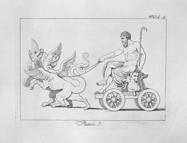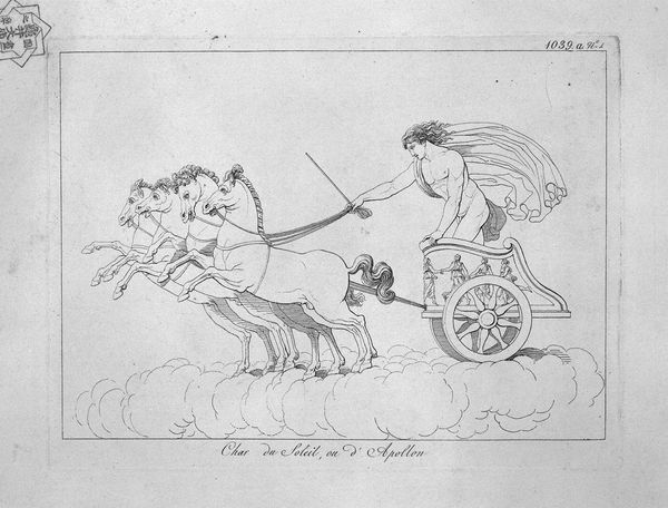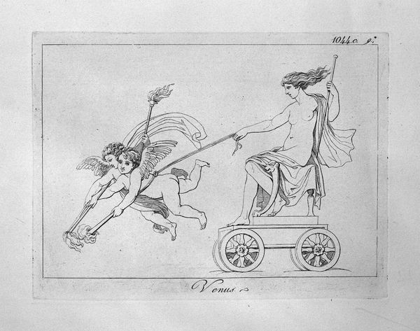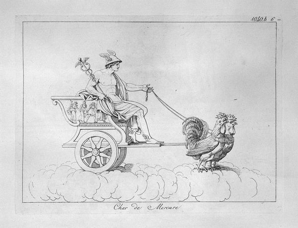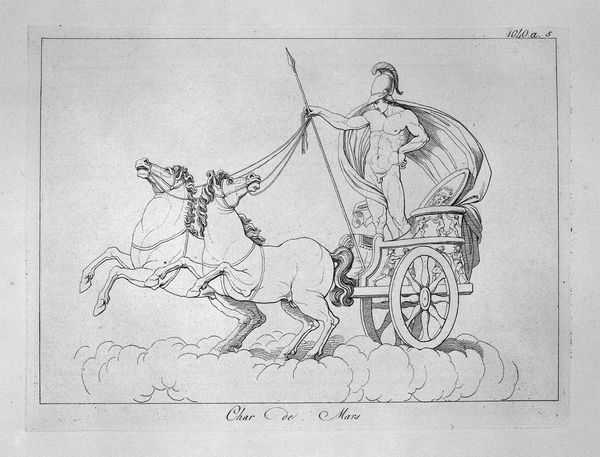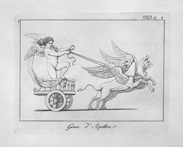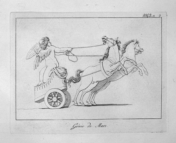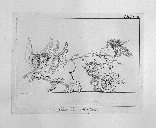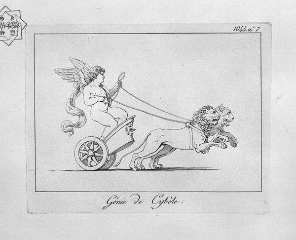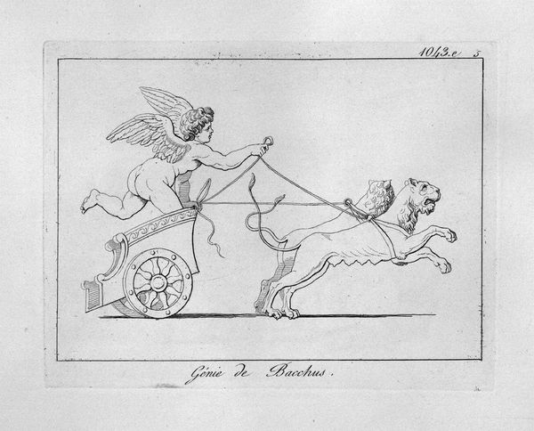 Giovanni Battista Piranesi created this etching titled 'Genius of Pan', where the stark lines and classical subject matter immediately capture the eye. The composition is dominated by a winged figure riding a chariot pulled by two goats. Notice how Piranesi uses precise, almost architectural lines to render the forms. This technique is characteristic of his approach to printmaking. The lines create sharp contrasts that define the musculature of the figures, giving them a sculptural quality. The visual tension arises from the dynamic positioning of the goats against the static posture of the winged figure, a fascinating dichotomy between raw nature and classical restraint. Piranesi, through his meticulous rendering of classical forms and his manipulation of line and space, challenges our understanding of historical and mythical themes. This piece not only showcases Piranesi's mastery of technique but also invites us to consider the interplay between form and content, and the ongoing dialogue between the past and the present.