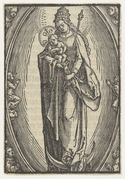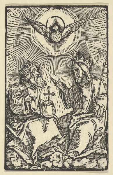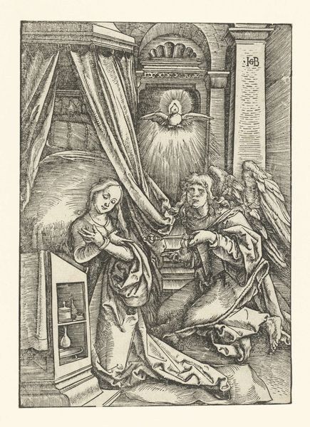Curator: Welcome. Today we'll be discussing Albrecht Durer's "Annunciatie" from 1503, currently held at the Rijksmuseum. This piece employs the woodcut medium, a technique prominent in the Northern Renaissance. Editor: Stark. Immediately, I notice how raw and intense the scene is—especially given the subject matter. The high contrast evokes a palpable sense of anxiety, a kind of resistance to what's transpiring. Curator: Precisely. Observe the meticulous lines. Durer's control over the woodcut creates a dynamic interplay between light and shadow. Note how the line dictates the folds in Mary’s dress and defines the angel's wings. There's an incredible texture achieved solely through line variation and density. Editor: And look at Mary's face. It's not the placid acceptance we often see in Annunciation scenes. She looks genuinely distressed, even afraid. Considering the era and the expectations placed on women, that reaction is intensely relevant. It challenges idealized versions of female piety. Curator: Indeed. But consider how Durer uses formal structure to underscore meaning. The composition—the angel kneeling before Mary, the light source above—reiterates a hierarchical relationship. The perspective, though somewhat flattened, directs our gaze toward the divine light. Editor: Still, I can't help but think about the social implications. Durer lived in a time of significant religious and social upheaval. The printing press democratized images, allowing for wider dissemination of religious narratives and implicitly offered the viewer more control over these religious views. Curator: That is undeniable, but do not reduce the visual expression in it to mere rhetoric! Durer masterfully merges technique and narrative. It reflects his keen awareness of form, and in this work the formal components are what lends it it’s particular and outstanding tone. Editor: Agreed! And that emotional and psychological intensity renders this early 16th-century woodcut strikingly current, in the face of modern realities of reproductive control. Curator: A fascinating intersection to contemplate.