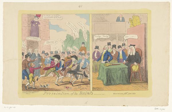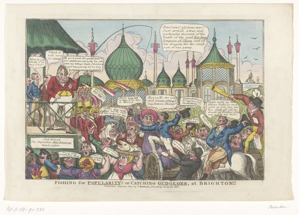In the early nineteenth century, London overtook Beijing to become the largest city in the world. The resulting congestion made London streets not only slow but terribly noisy. Rowlandson drew a farcical scene of city traffic, with chaotic sidewalks and streets mobbed with people, construction mishaps, and a stream of colliding carriages. The horses rear, the drivers turn their wips on one another, and the passengers are in an uproar. The inscription points out that such ordeals "allow you at least an hour or more than you require to sharpen your wits for table talk."
