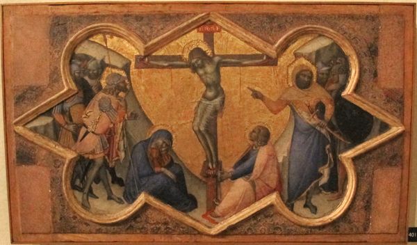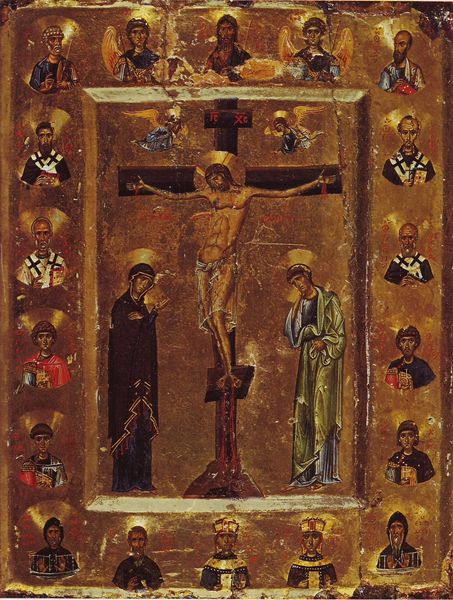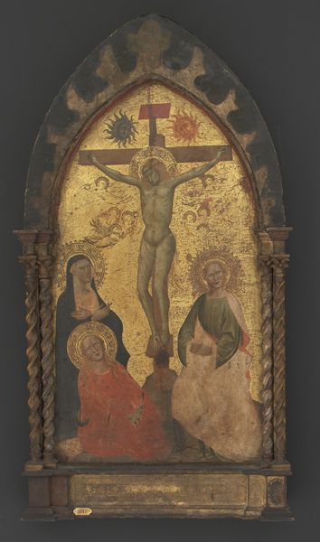 Editor: Here we have "The Crucifixion," an oil and tempera on panel created between 1360 and 1370 by Andrea di Cione, also known as Orcagna. Looking at it, I’m immediately struck by the way the golden background emphasizes the figures and makes the scene feel both dramatic and strangely detached. What catches your eye when you look at this piece? Curator: The dominance of gold, as you point out, is critical. It’s not merely decorative; it signifies the divine and positions this scene within a theological framework. Ask yourself, what socio-political function did this image serve at the time? Think about the power of the Church in the 14th century. Orcagna’s "Crucifixion" wasn't just about religious devotion, but also about reinforcing religious doctrine. Editor: So, it's about authority as much as faith? I guess the intense emotion shown in the faces surrounding the cross contrasts sharply with the rigid formality, creating a kind of visual tension. Curator: Precisely. Note how the figures of Christ, the Virgin Mary, and the angels are presented within a complex system of patronage and viewership. These images were deeply enmeshed in the social fabric. This wasn't passive observation, but an active participation in a system that governed life. What effect might the idealized, almost serene depiction of Christ have had on viewers confronting daily hardships like the plague or poverty? Editor: It’s like offering a promise of otherworldly peace and redemption despite the earthly suffering surrounding them. The details in the smaller panels depicting saints reinforce this connection. This makes me consider the communal experience this artwork would have fostered. Curator: Exactly. These artworks were very effective in medieval and early Renaissance society. So what happens to such an artwork once it enters a museum setting, like here at The Met? Editor: That’s a fascinating point. Being in a museum now, it loses some of its original socio-political punch and becomes an aesthetic object. That’s a powerful shift. Curator: Indeed. Recognizing the original context illuminates its lasting power but also forces us to confront how art’s meaning changes over time, within changing political and social spheres. Editor: Thanks, I now see the image with renewed eyes.