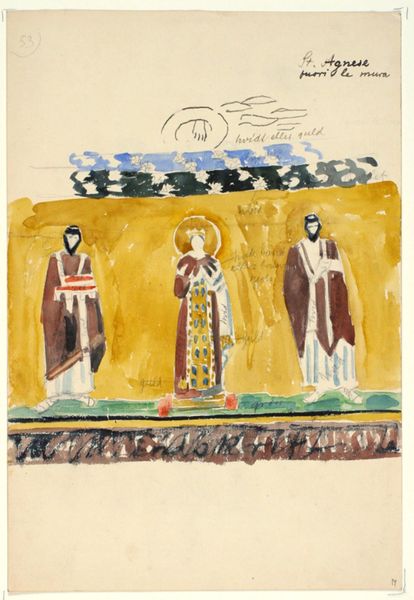 Curator: This watercolor and mixed-media work, titled "Three Personages," was completed by Nicholas Roerich in 1913, placing it squarely in the Russian Avant-Garde movement. The artwork resides in the Bakhrushin Theater Museum in Moscow. Editor: My first thought is a kind of solemnity. There's a static, almost ritualistic feel to their arrangement and expressions, like figures in an ancient fresco. Curator: That's perceptive. Roerich was deeply interested in symbolism and the spiritual weight of historical imagery. Considering the period, pre-revolutionary Russia was a hotbed for new explorations of national identity, and Roerich’s work here evokes Russia's medieval past through these figures and their traditional garments. Editor: The stylized faces certainly point to a focus beyond pure representation, more about conveying a specific idea. I’m drawn to how their clothes signify status and history; what can you tell me about that from a historical context? Curator: Costume designs often became imbued with cultural significance, particularly when referencing specific periods or regions. It seems that he sought inspiration from early Slavic dress, reflecting an idealized image of Russia's past, and the costumes certainly played a part in constructing a narrative for whatever production these figures were for. He saw history not as something past and done with, but as a source of ongoing symbolic power. The clothes denote that they might belong to early Slavic communities. Editor: Interesting. So it’s not just historical recreation, but a reimagining through a specific lens? And their faces almost look like masks— further removing any pretense of objective portraiture. Instead of individual personalities, are we seeing types, even archetypes? Curator: Absolutely. These characters aren’t specific individuals. Their visual representation evokes emotional, cultural and psychological echoes from the Slavic past. Note the ornamental patterning too. Such detail would’ve conveyed a clear meaning to contemporary audiences familiar with Russian folklore and identity. Editor: Makes me wonder what narratives they evoked for early 20th-century viewers versus what we see now. Regardless, this image holds a unique fascination—the layers of representation create a compelling mystery. Curator: Indeed. "Three Personages" remains a compelling lens through which to examine the intersection of art, theatre, and national identity in a time of significant cultural transformation.