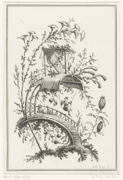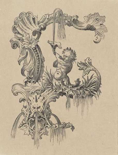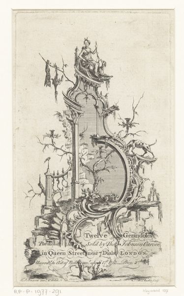 Curator: Here we have "Girandole met opgehangen wolf," an intriguing ink drawing that may date back to between 1755 and 1759. Editor: Well, it's certainly unsettling. At first glance, I thought it was an architectural study, but there’s something unnerving about the ornamentation… Curator: Note the wolf. Suspended as it is, it speaks volumes about vulnerability, and power dynamics in nature. It has strong bestial undertones. The architectural forms—are they celebratory or cages? What’s their symbolic weight here? Editor: It is interesting that you use the word celebratory, since that is how it first reads before noticing it has death imagery hanging. And I see your point—these forms, executed in ink on paper, highlight the craft of architectural design while embedding layers of violence or subjugation. We think of drawings on paper to work towards real objects for human use, but this is ornamental. Are they for celebrating hunts and trade, or designed to create hierarchies of space? Curator: The contrast between delicate baroque and grim subject matter is quite unsettling, isn't it? The symbolic language here is complicated and reveals social undercurrents present even in art pieces crafted for design and pleasure. I'm curious about its original purpose and place within the Rijksmuseum collection. How does it contribute to cultural memory through such peculiar iconography? Editor: Right—it forces us to consider production within a historical frame of exploitation. What kind of paper was used? Who supplied the ink? Where the designs realized as permanent material forms? These decisions always have consequences within the realm of both art and function. I want to follow this wolf from ink to whatever final realization it has through societal channels, to learn more about how baroque styles trickle into society. Curator: Agreed. Considering this, this image offers not just artistic intrigue but also historical and cultural insights. Editor: The true craft of any form lives on, whether we like to accept it, or not.
