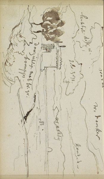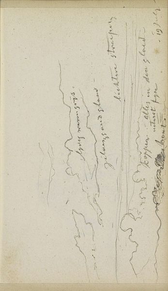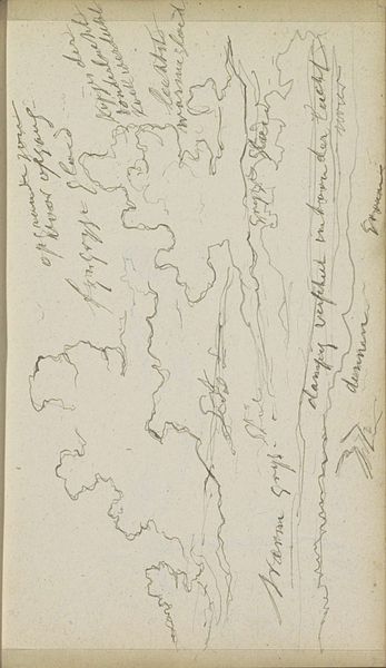 Editor: This is *Landschap met bomen en een wolkenlucht*—Landscape with Trees and Clouds— a pen and ink drawing done around 1862-1864 by Johannes Tavenraat. It feels almost like a fleeting impression, something he captured quickly *en plein air.* What stands out to you when you look at this sketch? Curator: Fleeting, yes, like trying to hold onto a particularly vivid dream. For me, it's the sky that commands attention. The clouds aren't just fluffy nothings; they’re alive, almost turbulent. There’s a real drama unfolding above the more settled landscape. It’s Romantic, isn’t it? Did you notice how he’s captured the light? Editor: I can definitely see the Romanticism—the emotional intensity is palpable. But the line work also feels very deliberate, almost architectural, in its precision, especially in the trees along what might be the water’s edge. Curator: Precisely! It’s a beautiful tension, isn’t it? The wildness of the sky grounded by that delicate, precise foreground. Tavenraat manages to be both storm-tossed and serene at the same time. Does it make you want to pick up your pen and sketch? Editor: Absolutely. It’s a reminder that even a few simple lines can evoke a whole world of feeling and atmosphere. I came looking for landscapes; now, I want to know more about light! Curator: Me too. And perhaps that is Tavenraat’s quiet genius—to ignite in us that very desire. The best art always leaves us hungry for more, don't you think?