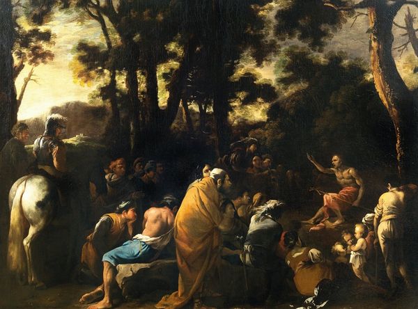 Curator: Here we have a work titled "The Raising of Lazarus," created sometime between 1600 and 1700. Editor: Wow, I can practically smell the damp earth. And look at that, he's emerging from darkness like a strange chrysalis—quite visceral. Curator: The artwork is currently housed in the Rijksmuseum and is attributed to Peter Paul Rubens. It's an oil painting depicting a rather significant moment from the New Testament. Editor: Right, the miracle. But what strikes me is the pure theatre of it all. Look at the light, practically spotlighting Lazarus. It feels less about solemn reverence and more about the sheer spectacle of resurrection. Rubens truly knew how to compose a crowd, everyone reacts, there is no emotional middle ground here. Curator: That's characteristic of the Baroque style, wouldn’t you say? It employs high drama, intense emotion, and a certain exuberance. Consider the symbolism. Lazarus wrapped in linen is a familiar image that has accumulated potent emotional significance across multiple cultures over time. Here he goes from death to life! Editor: Absolutely, it’s designed to be overwhelming! And it does sort of connect us to death and the rituals of life surrounding death. Like, you see him wrapped in that cloth and it triggers a set of feelings, fears, about death, or your grandmother or that dog you used to have. Curator: A deeply layered piece then. Beyond its literal interpretation, it touches on the universal human anxieties surrounding mortality and the hope for transcendence. Editor: It has an emotional heft; seeing this image sort of puts into perspective how hope and horror coexist—or in this case, are separated by mere cloth, held together through faith. I am almost getting existential chills. Curator: Indeed. An artwork of both its time and beyond it. Editor: You nailed it. A heavy trip but, undeniably, impactful.