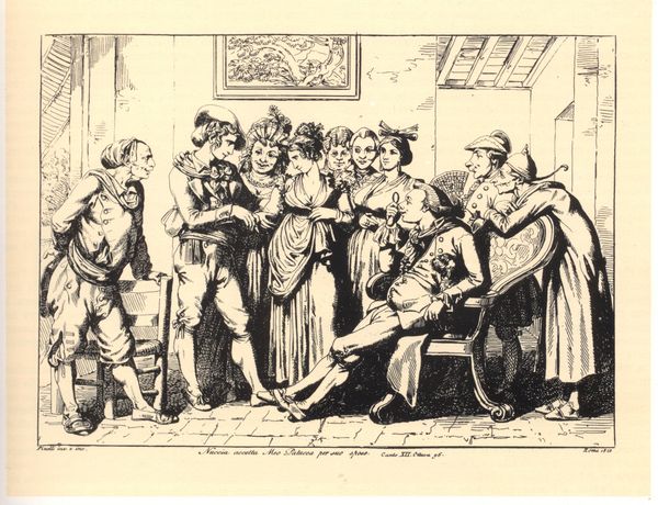 Curator: This is John Flaxman's "Illustration to Odyssey," an ink and pen drawing on paper, created in 1793. Editor: It strikes me as an exercise in pure line. Very spare, almost ascetic in its presentation of classical forms and themes. Curator: Absolutely. Flaxman was a key figure in the Neoclassical movement, embracing the aesthetics of ancient Greece and Rome. He was hugely influential and particularly well-known for his outline illustrations to Homer. This piece is from that very series. Editor: And that classical restraint is heavy with meaning, isn’t it? Look at the symbolism in the figures—their poses communicate entire narratives through minimal detail. Is the seated man Odysseus? He radiates defeat, slumped and apart. Curator: Yes, that's right. This would likely be illustrating a moment from the Odyssey narrative, perhaps a moment of reflection for Odysseus after enduring one of the many trials on his long journey home. We know that Flaxman's interpretations shaped the visual culture surrounding Homer for generations. Think about the power and the legacy of that—visualizing some of our oldest and most treasured cultural material. Editor: I see echoes of Roman sculpture in the drapery, the folds suggesting form and emotion with incredible efficiency. Even the white space seems purposeful, emphasizing the figures' isolation. Curator: I think that white space reflects more about social and economic circumstances for art production and display during Flaxman's period. Flaxman worked mostly for engravers, and was trying to appeal to broader markets. This means images were meant to be reproduced in large scale. Flaxman needed images that could be accessible as reproducible images that did not need access to special printing technologies. Editor: I appreciate the restraint now as a product of technological constraints, rather than exclusively the author's intention. It gives the piece a raw, almost diagrammatic quality, laying bare the bones of the story. Curator: Well, regardless of our views of artistic intentions, what’s evident is Flaxman's enduring influence on visual storytelling. It reminds me to see how interpretations shift across time. Editor: And for me, it highlights the potent, universal language of form and symbol, resonating even across centuries.