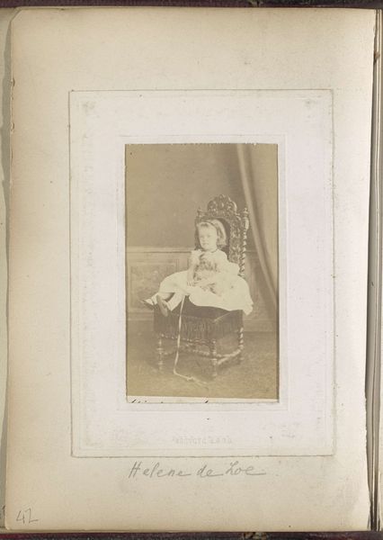 Editor: Here we have Jules Géruzet’s photograph, "Portrait of a Girl, Sitting in a Chair," taken sometime between 1859 and 1874. There's a real stillness to the image, almost like a staged tableau vivant. The little dog adds to this impression. What stands out to you? Curator: I'm immediately drawn to how the image operates as a signifier of innocence and societal expectations. The girl, framed within ornate arches and seated in a formal chair, embodies a Victorian ideal. Consider the contrasting textures - the plushness of the dog's fur against the rigid lines of the chair. Does this contrast speak to any duality? Editor: Maybe the tension between childhood freedom and adult expectations? Curator: Precisely. And the presence of the dog – not merely a pet, but a symbol of loyalty and domesticity. Its inclusion invites contemplation of how animals became interwoven with the construction of family identity during this period. It's worth noting that, culturally, the pet acts as an emotional proxy. In many cases throughout time, such an inclusion reveals things difficult to convey. Would you agree? Editor: Yes, definitely. The dog feels like a stand-in for affection, a companion in a somewhat formal setting. Curator: The staging enhances that interpretation. We’re presented with a calculated image of what a young girl “should” be, filtered through a lens of cultural aspirations. It reminds me how images preserve certain collective dreams or anxieties about future generations. Editor: I hadn't thought about how much these seemingly simple portraits reveal about societal values. Curator: Absolutely. And how a single photograph can encapsulate a whole era's understanding of childhood and belonging. There's an interplay of imposed representation versus nascent personality at work here.