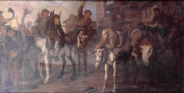 Editor: Francis Le Piper's "Hudibras's First Encounter with the Bear-Baiters" captures a chaotic scene in oil. It's quite small, but very dynamic. What statements do you think Le Piper is trying to make with this piece? Curator: Well, the painting provides a window into 17th-century English society, revealing the brutal spectacle of bear-baiting, and its popularity. Consider the social hierarchies being reinforced here. Who do you think benefits from this display of violence? Editor: I guess the elite? It seems almost like a political statement. Curator: Precisely! Le Piper may be critiquing those in power, suggesting that such spectacles serve as distractions from deeper social issues. What does the reaction of the crowd tell us? Editor: I see. So the painting isn't just about the event itself, but about who is watching and why. Curator: Exactly. It challenges us to question the ethics of entertainment and the role of art in reflecting societal values. Editor: I will never look at entertainment the same way. Thanks!