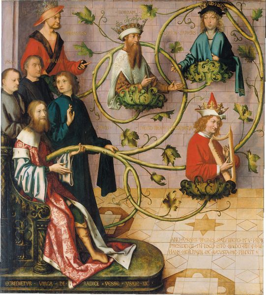 Curator: Here we see "The Chess Players" an oil-on-wood panel attributed to Liberale da Verona, created sometime between 1470 and 1480, currently residing at The Met. I must say, its rigid symmetry immediately grabs me. Editor: The first thing that strikes me is the cool detachment of the figures, an almost dreamlike state. Despite the chessboard implying strategy and rivalry, there's an emotional stillness that pervades the scene. Curator: Well, chess has always been more than just a game. It is a field where war and status unfold, it echoes symbolic conflict, especially in aristocratic circles. The chess game can be a symbol for courtship, diplomacy, and intellectual prowess. And the figures almost theatrically posed—are certainly aristocratic! Editor: Precisely, notice the distribution of light and shadow. The figures’ faces, while serene, are subtly shaded to create a sense of depth and individuality. It draws me into this space where something significant is happening. This chessboard and these pieces function like compositional guide, focusing the viewer’s eyes towards it as the narrative pivot. Curator: And who are these spectators hovering at the edges? Notice how their faces reflect in ways which resonate in relation to certain pieces? This could hint at alliances or strategies, offering a coded narrative for those who knew the social dynamics of the time. We often ignore the people on the fringes but in reality, they play a role of subtle instigation of how the figures may perform. Editor: Interesting. From a formal perspective, that repetition of shapes - those very stylised curly hair motifs framing each face - does suggest something ceremonial, something formalized that transcends merely representing a friendly game. Curator: Agreed. And by extension, that carefully orchestrated presentation—it speaks volumes about the values and aspirations of the Italian Renaissance. What do you think we as a collective value about strategic engagement in our own period in time? Do you feel anything of that same kind resonates still? Editor: Food for thought, indeed. Reflecting upon the artifice presented versus lived experience, certainly gives us much to take away from Liberale da Verona.