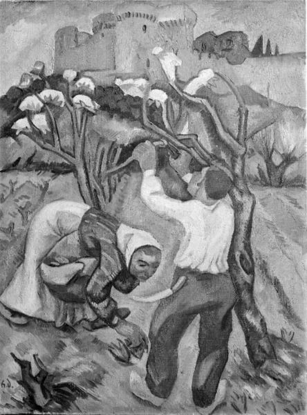 Henri Doucet created this oil painting, Grape Picking, of modest size, sometime before his death in 1915. Immediately we see the artist’s dynamic brushwork, which articulates the figures and the background in short strokes that define the forms and objects. Compositionally, the painting is divided into two main sections: the upper part, dominated by a woman standing on a chair and picking grapes, and the lower part, featuring a seated figure with a basket. The limited palette of grays and whites contributes to the somber mood, yet the active brushstrokes create a sense of movement and energy. The shapes are simplified, almost abstracted, hinting at an engagement with early modernist aesthetics. Doucet challenges conventional representation by flattening the picture plane and reducing the illusion of depth. This stylistic choice, combined with the limited color range, emphasizes the formal qualities of the painting—line, shape, and texture—over realistic depiction. The focus is not merely on the subject but on the act of painting itself.