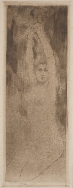 Editor: This is Richard Nicolaüs Roland Holst's 1892 pencil drawing, "Two Standing Figures, after Matthijs Maris." It’s quite faint and spectral, almost like two ghosts emerging from the paper. What do you see in the way this work was constructed? Curator: Given the "after Matthijs Maris" title, I look first at Holst’s engagement with existing artistic production. How does he reproduce and transform Maris’ style and imagery? Maris was known for his dreamy, melancholic figures, often set in misty landscapes. Holst captures that mood, but simplifies it, bringing the materiality of the pencil – the very instrument of artistic labor – to the forefront. Editor: So you’re less interested in the symbolism, and more in the physical act of drawing, the choice of pencil, and how it relates to Maris’ original work? Curator: Precisely. The medium here *is* the message. Consider the labor involved in creating this ethereal effect with such a direct, humble tool. Why not paint? Or charcoal? What is Holst trying to say about artistic production by using a pencil, referencing another artist's vision? Is he paying homage, critiquing, or appropriating? What does "after" really mean here? The 'copy' carries meaning, doesn't it? Editor: It almost makes it seem less precious, more accessible somehow. Maris' paintings can feel so… lofty. But a pencil drawing… everyone understands pencil. Curator: Exactly. And that understanding, that relationship with the means of production, shapes our perception of the subject. We’re not just seeing two figures; we’re seeing Holst's engagement with art history and the means of replicating that history, literally through the labor of his hand, through the mass producible medium of pencil. Editor: I hadn’t thought of it that way before – as a comment on art production itself. Thanks for pointing out that material lens! Curator: My pleasure. Considering the materials always enriches the story.