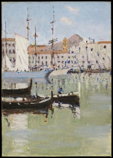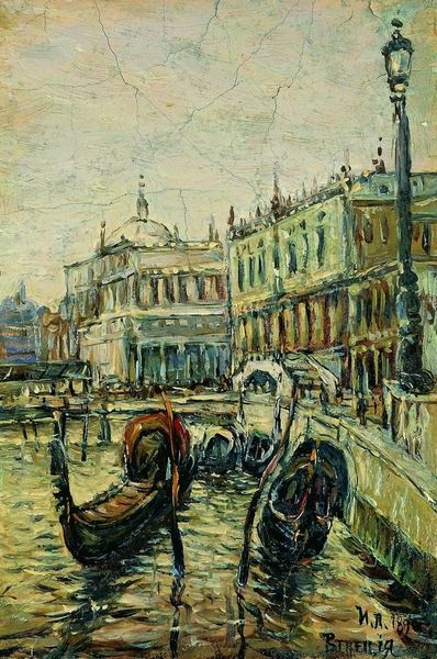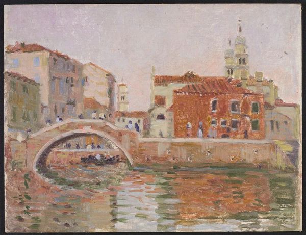 Curator: Let’s spend a moment with Denman Waldo Ross's small oil on canvas titled, "View of the Canal, Venice". Editor: It feels like a memory, doesn't it? A quick, impressionistic sketch of a place more felt than seen. Curator: Indeed. The painting's composition directs our eyes along the canal, framed by the architecture on either side, towards the arched bridge in the distance. The materiality of the paint, its texture, is key to this effect. Editor: True, and look how he captures the light on the water, those shimmering greens and yellows! Venice is always a dream, and Denman shows it is one even during the day. Curator: Absolutely. The painting’s value is in its intimate portrayal of Venice—a place of dreams as you put it. Editor: Well, I know I would hang that beauty up in my house. It feels so cozy! Curator: It has certainly given me a new perspective on Venice and Ross. Editor: Me too, it is like a slice of history, but make it fashion.