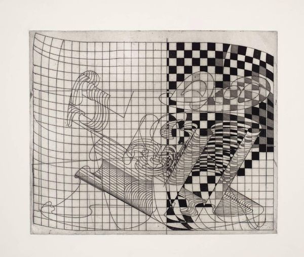 Editor: Here we have Tim Mara's "Plastic Glove and Wire Brush," currently held in the Tate Collections. I'm immediately struck by the stark contrast between the shiny glove and the bristled brush. What is your interpretation of the visual relationship here? Curator: The composition relies on contrasting textures and colours. Notice how the cool blue above emphasizes the glove's metallic sheen, while the dark ground highlights the brush’s coarse texture. The hard lines create a tense visual field. What tensions or harmonies might arise from such juxtapositions? Editor: It’s interesting to consider the surface qualities and how they interact. I hadn't considered the idea of visual tension. Curator: Indeed, by focusing on form and the arrangement of these forms, we can see how Mara constructs meaning through purely visual means. Editor: This close look at form has given me a new appreciation for the artist’s choices. Curator: Precisely. These formal elements are not just aesthetic; they are the very language of the artwork.