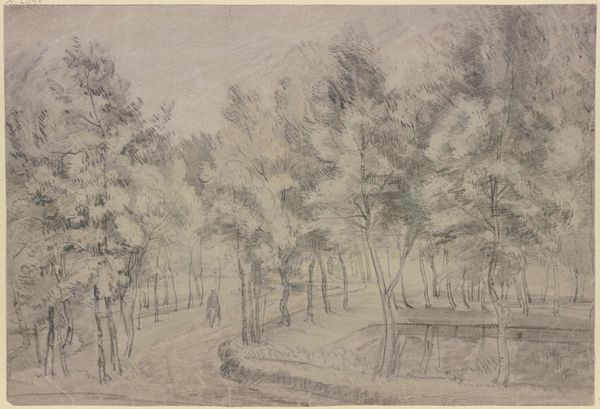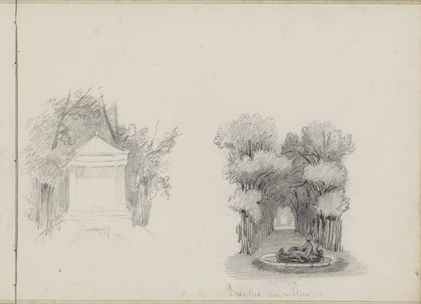 Curator: This is "Torhaus zum Schloss Kleinheubach," a pencil drawing executed in 1868 by Louis Eysen. The work, now held at the Städel Museum, captures a view of a gatehouse. Editor: My initial reaction is one of quiet observation. There's a beautiful stillness and detailed focus conveyed despite the simplicity of the medium. The density of the foliage nearly overwhelms the architectural forms behind it. Curator: Yes, there’s a lovely tension between nature and artifice typical of the Romantic sensibility. The gatehouse, almost hidden, seems to represent a bygone era, a structure with a memory of power that is gradually fading. It feels allegorical. Editor: I am more drawn to the paper itself and the immediate labour evident in the gradations of pencil. The hand of the artist feels incredibly close. What was the ready availability and ease of using paper to create these images meant at the time for popular artmaking? I notice the variety of pencil strokes—hatching, smudging—each serving a particular function to build tone and texture. Curator: A keen observation, it's tempting to consider that the gate could also act as an access point to reflection. Gates feature prominently as thresholds in psychological symbol systems that provide transitional spaces from one state to the next. Editor: Fascinating, and the relative affordability of the pencil, together with the proliferation of paper mills, undoubtedly democratized artmaking. This simple sketch allows for that possibility in a much wider way as the availability of industrial materials grew for artists and the working class alike. Curator: Ultimately, this work holds both a deep connection to nature, represented by the trees, and the symbolic resonance of transition. It captures both physical place and interior space, prompting us to reflect. Editor: For me, this work really showcases how readily available materials allow for close, immediate experiences of daily life. Thank you for drawing attention to those nuances.