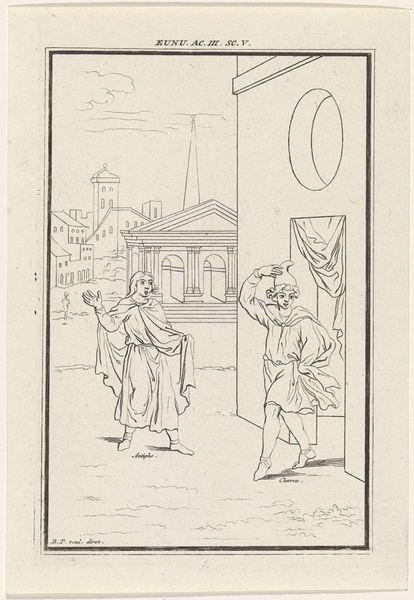Curator: Ah, look at this. From the 17th century, we have a work entitled "Copy of L'Homme Vu de Dos, Avec un Grand Épée (Man Viewed from Behind, With a Large Sword)," from “Les Caprices” Series A, The Florence Set. It's an engraving. Editor: My first thought? Swagger! Pompous but... elegant? It's minimalist yet somehow excessive, especially with the feathery hat and ridiculously large sword. I feel like I am about to be challenged to a duel! Curator: Yes, the "sword" is part of the iconographic language. Remember, the sword represents power, justice, military strength. The turned back might signify contemplation or withdrawal, perhaps a reluctance to engage directly. Do you notice any social commentary here? Editor: Hmmm... Is it just me, or does that pose look super uncomfortable? The one leaning on the block almost looks as if he’s fallen over and someone propped him back up... To me, it’s more an embodiment of vanity – look at my sword! Admire my puffy pants! But... is anyone actually looking? It’s like a satire of the era's masculine ideals? Curator: Precisely. And academic art often used this posture to idealize classical human forms; by showing it this way, there’s satire. It’s an anonymous work, we do not know who created this, which suggests its aim to represent archetypes, the social classes as broad characters of history instead of unique individuals, maybe the military class particularly? Editor: Anonymous? Fascinating! It lets you project whatever anxieties or ideas about class, gender, or power you might have right onto it. A collective caricature! It also reflects the ephemeral, reproducible quality of the image, what it aimed to represent. A distributed form of commentary in a world of elites, printed by and for whom exactly? Curator: Perhaps. It also provides an excellent mirror into the values that remained constant across the century: class consciousness, visible shows of masculinity, maybe also with an incipient, ironic consciousness. Editor: I suppose you’re right. The work has an aura, that "cultural memory" thing, of a whole societal mood encapsulated by one haughty dude and his gigantic sword...