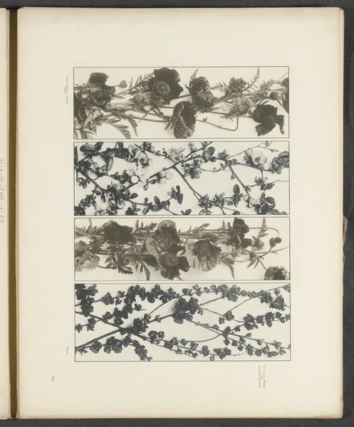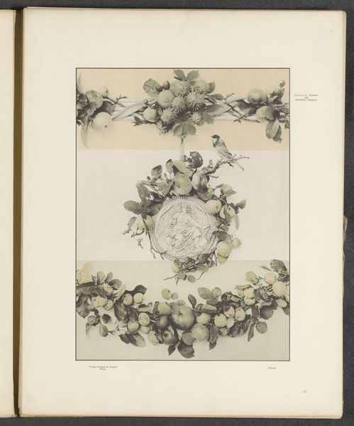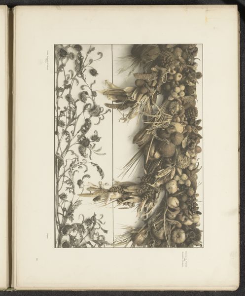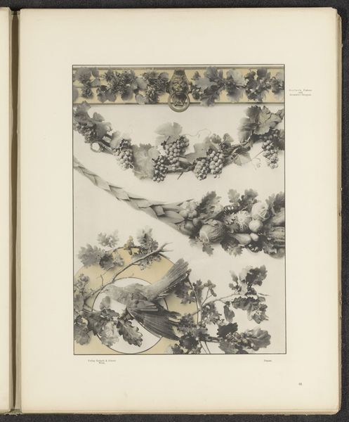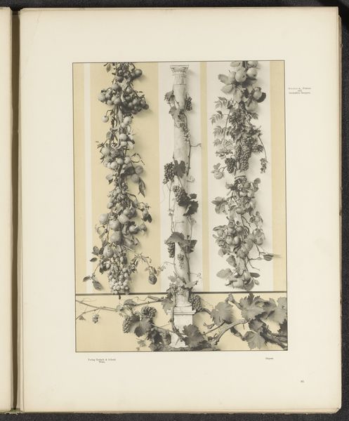 Curator: Immediately, I'm struck by its sense of abundant nature rendered in such muted tones; there's a paradox at play here. Editor: This is “Wijnranken met fruit en hop,” or “Vine Branches with Fruit and Hop.” It's a drawing on paper of unknown authorship dating to before 1897, made with what looks like watercolor paint. It shows three horizontal sections. The top displays hops, the middle various fruits, and the bottom grapes. Curator: Ah, hops, fruits, grapes...All key to alcoholic beverages and evoking convivial feasts and symbolic meanings around Bacchus or Dionysus. Given its probable age, was this meant as some form of scientific illustration, or perhaps an artistic flourish within a commercial venture? Editor: It very well could be connected to the booming industries and scientific advancements related to brewing, fermentation, and botany from the period. Hop cultivation, winemaking – these activities had complex socio-economic implications for European cultures. An image like this subtly celebrates that industry while hinting at nature's bounty being tamed. Curator: The presentation almost flattens nature into these rows of cultivated bounty, yet I do wonder if there’s more to this drawing. Given that fruits are prominently displayed here, might the reference allude not only to harvest but to renewal or even a moral imperative towards industriousness. Perhaps I'm reading too much into it. Editor: No, I think your points are well-placed. We see this blending of secular imagery, almost mundane subject matter even, merging into profound meanings, playing on cultural values and aspirations from a burgeoning industrialized period. A work of subtle ambition indeed. Curator: Well, thank you for pointing out these connections! It certainly brings a different dimension to how I’ll approach my next scholarly examination of art. Editor: The pleasure was all mine; this exercise highlighted once more how iconography allows access to societal and artistic developments from our shared past.