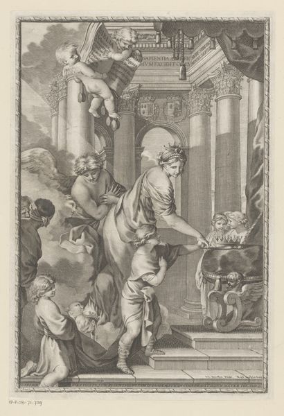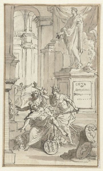 Jan Goeree created this drawing, "Figuren rond een standbeeld van de Minerva als Roma," using pen and brush in grey ink, around the turn of the 18th century. It’s a classical scene, complete with statuary and Roman soldiers, yet it is rendered with fluid, energetic lines, bringing it vividly to life. The drawing’s power resides in this interplay of formal, almost academic subject matter, and the artist’s evident pleasure in the handling of his materials. Look closely, and you can see the subtle variations in tone achieved by layering the grey ink. Notice, too, how Goeree uses the varying thickness of his lines to create a sense of depth and volume. The use of pen and brush allowed for both precision and expressive freedom, a combination that perfectly suits the image. While the subject matter might suggest a grand, historical narrative, the artist’s technique keeps the drawing intimate and immediate. This reminds us that even the most imposing subjects are always filtered through the artist’s hand.