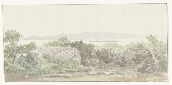 Hendrik Voogd made this drawing of Castel Gandolfo from the shore of the lake with pen in brown and black, brush in brown and gray, and black chalk. Voogd, a Dutchman, spent much of his career in Rome, a popular destination for Northern European artists seeking classical inspiration and Italian light. This landscape presents us with an interesting tension: on one hand, it embodies the Romantic era's emphasis on nature and the picturesque, yet it also hints at the power structures inherent in landscape art. Who has the privilege to leisurely view this vista? Whose labor sustains the idyllic scene? It invites us to consider whose stories are told, and whose are left out of this seemingly tranquil depiction of the Italian countryside. The focus is on the aesthetic experience of the landscape, which potentially obscures the complex social and economic realities of the time.