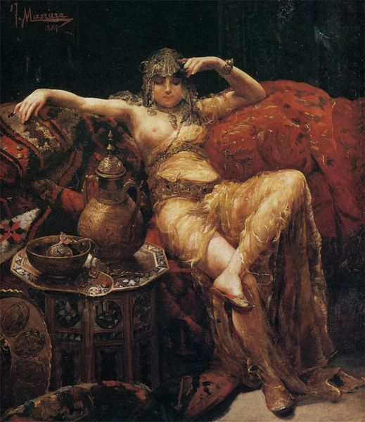 Jean-Joseph-Benjamin Constant rendered this painting of Queen Herodiade using oil paint on canvas. The handling of oil paint is central to its appearance, as its inherent qualities are carefully manipulated to create texture, weight, color, and form. The artist built up layers of pigment, allowing the paint to partially blend, capturing the play of light and shadow across the scene, particularly the draping of the Queen’s dress and her bare skin. Constant's work fits neatly into the Orientalist genre that emerged in the 19th century, in which European artists interpreted the ‘East’ through romanticized lenses. The painting's opulence may evoke a world of luxury and exoticism, but at its core, it is made possible by the often invisible work of those who mine pigments, weave fabrics, and craft jewelry, calling to question the relationship between art and labor. In the end, appreciating the materials and making processes in art allows us to look beyond surface appearances and understand the deeper cultural and social contexts.