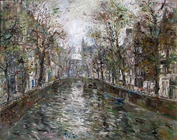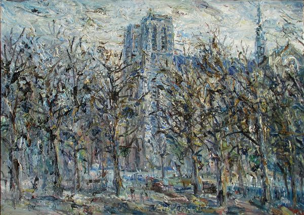 Art Historian: We’re standing before "Roma, San Giovanni," an oil painting by Włodzimierz Zakrzewski, created in 1970. The piece plunges us into a Roman cityscape. Curator: My initial impression? A palpable sense of decay, even neglect. There’s something heavy in the brushstrokes, mirroring the weight of history, perhaps the crumbling of empires, reflected in the trees looming over the central space. Art Historian: Exactly! Observe how Zakrzewski employs a Neo-Expressionist style; the very texture of the oil paint conveys a deeper psychological landscape. Notice how bare branches claw at a tumultuous sky; skeletal trees stand as silent witnesses. It's a powerful juxtaposition, evoking both life and loss. Curator: But let's not forget the context in which this work appeared. 1970 marked a period of immense social change, the struggles for civil rights and liberation movements around the world. How might this affect our view of Zakrzewski's symbolic portrayal of a city in transition, perhaps reflecting societal anxieties of the era? Is the grandeur simply a facade? Art Historian: A valid interpretation! In Christian symbolism, the trees can stand for the cross. And the towering structure in the background surely carries complex cultural connotations as it represents Saint John Lateran—the Cathedral of Rome, an icon of power and religion throughout the centuries. It stands, even now. Is Zakrzewski commenting on faith or is the image used in some ironic sense? Curator: It leads me to consider the impact of tourism and its effect on sacred spaces. Are we simply consuming history without acknowledging the layered inequalities it holds, which is what it means for the place in the Roman cultural and political identity, its ongoing meaning for current Romans? The lack of human presence emphasizes a hollowness, even alienation from community and continuity. Art Historian: But still—notice how that absence allows the architectural forms to speak for themselves, highlighting both grandeur and possible vulnerability. It reminds us of cycles: what rises will, eventually, fall—and what appears dead can come to life once more. Curator: Ultimately, I see this cityscape as less of a literal depiction and more of a metaphorical meditation on power structures and what has been lost or suppressed along the way, leaving the viewer contemplating where true hope lies. Art Historian: Perhaps... And regardless, Zakrzewski challenges us to consider Rome—and ourselves—beyond the surface of mere postcard imagery, using layered symbols as emotional portals.