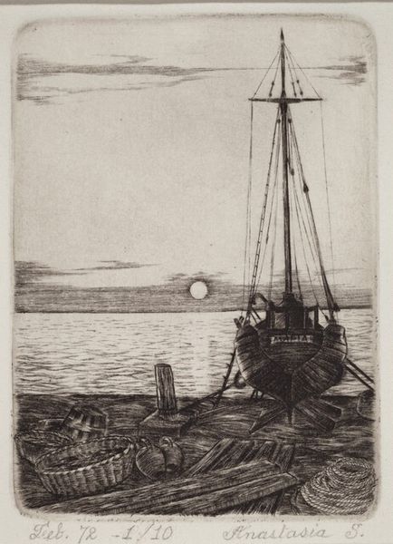 George Bradshaw made this etching, 'The Lone Goose', sometime in the first half of the 20th century; it looks like. There's something so immediate about the way he has scratched this scene into being, using the etching needle like a kind of stylus, almost like drawing. The texture of the canoe, made up of these tiny marks, suggests a kind of woven material. Look closely at the man in the canoe and how he merges with the shadows. His figure is built up with a network of fine lines. There is a lone goose flying overhead, barely visible, this tiny element balances the composition beautifully. The reflection of the boat in the water is slightly blurred, it shimmers like a memory. The subtle tones and textures in 'The Lone Goose' remind me of some of Whistler's nocturnal scenes, there's a similar feeling of quiet contemplation. Art is always a conversation across time, isn't it? Bradshaw leaves us with more questions than answers, embracing the ambiguity of life.