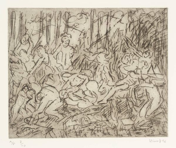 Hans Gustav Burkhardt made "Nude Figures in Landscape" on paper with charcoal. The powdery, soft material allows for a range of tonal variations, from light grays to deep blacks. Burkhardt's expressive use of charcoal suggests a raw, gestural approach. The marks are urgent, conveying a sense of immediacy. Notice the thick, dark lines defining the figures and landscape elements, contrasting with the smudged areas that create depth and shadow. This contrast gives the composition dynamism, as if capturing a fleeting moment in time. The figures, rendered with bold strokes, suggest both strength and vulnerability. Charcoal, easily manipulated and erased, lends itself to this exploration of form and emotion. The artist isn't necessarily interested in capturing an exact likeness, but in conveying the essence of human form within a natural environment. The very material speaks to this process of becoming. Burkhardt's choice of charcoal reflects a tradition of drawing as a primary mode of artistic expression, emphasizing the artist's hand and the directness of the creative act. It challenges the idea of art as mere representation, highlighting the importance of material, process, and the artist's engagement with the world.