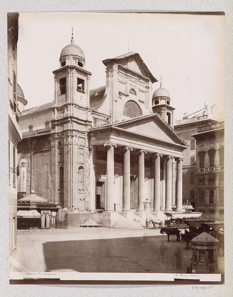Editor: This is Giuseppe Barberis’s 1892 engraving, “Acireale: Basilica of San Sebastiano.” It's a beautifully detailed rendering. The architectural ornamentation seems incredibly intricate and meticulously presented. What strikes you about this work? Curator: Well, engravings like these served a critical public role in the late 19th century. Photography was still developing, so prints like these democratized access to architectural wonders. Consider this image as a form of cultural documentation. Does the scale and grandeur feel emphasized to you? Editor: Absolutely! The figures in the foreground give a real sense of the Basilica’s size. It feels monumental, a deliberate choice, I imagine? Curator: Precisely. The composition isn't just about documenting the Basilica; it’s about presenting it as a symbol of civic pride, perhaps even a statement of religious and political authority. We have to ask who was commissioning and consuming images like this. Were these meant for locals, tourists, or an elite class? Editor: That's a great point. It does seem designed to inspire awe, making one consider how its reception changed according to social class. Were prints such as this common at the time? Curator: Quite. Printed imagery had exploded, fueled by industrialization and new printing technologies. Think of this print within the larger context of image proliferation and its influence on public perceptions. Considering the Italian Renaissance influence, how was this Basilica conceived in its contemporary political context? Editor: That pushes me to think of how a work might reflect cultural aspirations, perhaps constructing a sense of continuity and authority during a period of significant social change. It seems such a seemingly simple depiction carries so much cultural information. Curator: Precisely, these kinds of architectural records are revealing visual artifacts! This teaches us how art shapes social and political imaginaries.
