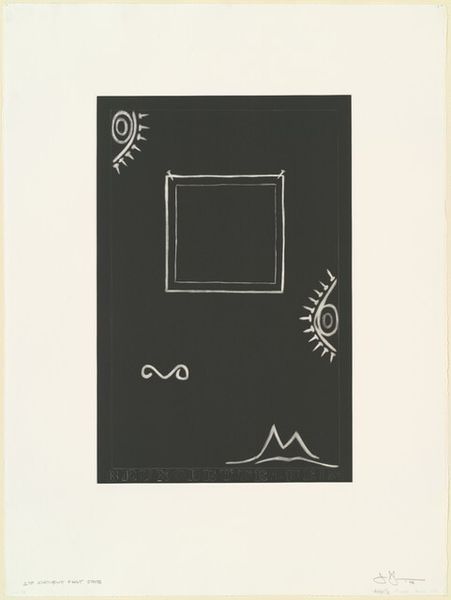 This is Jasper Johns' "Face with Watch", a print created using lithography, a process where an image is drawn on a stone or metal plate and then printed. What's fascinating here is how Johns uses this process to explore themes of time, representation, and the everyday. The stark contrast between the black background and the white imagery, achieved through the lithographic process, makes each element stand out. The watch, a common object, is rendered with the same attention as the more abstract "face," challenging our perception of value and importance. Lithography, with its roots in mass production, democratized image-making. Johns elevates this process, transforming what was once a commercial technique into a fine art medium. Through his blurring of boundaries between art and the everyday, Johns prompts us to reconsider the artistic potential of commonplace materials and processes, and the cultural significance we assign to them.