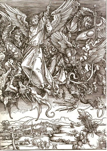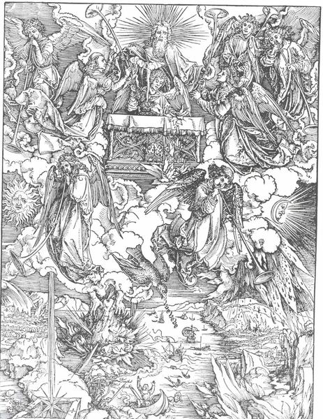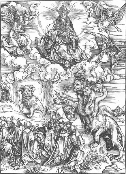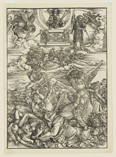 Curator: Albrecht Durer's "The Battle of the Angels", a woodcut from 1498, simply bursts with energy. Editor: My first thought? It’s a teeming chaos, all these tiny lines creating such a frenetic scene. There's a sort of controlled frenzy in the crosshatching. Curator: Indeed. Durer's skill lies in bringing order to chaos. This piece, part of his Apocalypse series, depicts the war in heaven from the Book of Revelation. It’s fascinating how Durer interprets such a grandiose, abstract conflict using the accessible medium of printmaking. Editor: And accessible it was! These prints circulated widely, disseminating his vision of impending doom to a broad audience. The politics of imagery indeed. What impact! Can you speak more about how he balances heaven and earth, sacred and secular in this tumultuous print? Curator: The composition is brilliant. At the top, a serene God enthroned, flanked by angels announcing judgment. Below, total warfare! Angels clash with demonic forces; there is real violence. The Ark of the Covenant hovers above as an interesting addition; a sign of promise. That tension, I think, captures a key aspect of the turn of the millennium—the anxiety about the future coupled with hope for divine intervention. Editor: Right. But look at how Dürer represents his angels, clad in what looks like Roman armor, bearing down upon foes rendered as grotesque caricatures! He’s universalizing the concept of the end, isn't he? What a mix of faith and doubt during those times! Curator: Absolutely. He is also a savvy marketer, embedding his artist's monogram so prominently in the work. Editor: Ah, yes! So we don't forget the artistic genius bringing us this divine battle scene. All that ink, all those details—really does bring the era of disruption and religious turmoil right into this space. Curator: Precisely! I keep coming back to the emotional weight this image carries despite its relatively small size. Amazing what you can do with lines on wood. Editor: The enduring power of witnessing a struggle this way, isn’t it? Well, thanks for unveiling all of these interesting concepts of "The Battle of the Angels," it is time we wrap this up and bring us to the next scene!