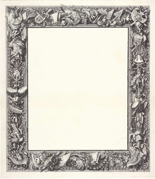 This is a 16th-century border design made by Pieter Huys, rendered with etching on paper. The etched lines create a delicate, detailed composition, with motifs of plants, insects and animals. The process of etching is quite interesting. The artist covers a metal plate with a waxy, acid-resistant coating, then scratches away the coating with a needle to expose the metal. When the plate is dipped in acid, the exposed lines are eaten away, creating grooves. Ink is then applied to the plate, filling the grooves, and the surface is wiped clean. Finally, the plate is pressed onto paper, transferring the ink and creating the print. In this case, we can see how the precision of the etching technique lends itself well to the depiction of naturalistic elements. The texture of leaves and the intricate details of insects are captured with remarkable clarity. The border itself, made with a printmaking process, would have framed another image, perhaps a devotional scene. Consider how the labor-intensive process of etching elevates the value of these images, blurring the lines between craft and fine art.