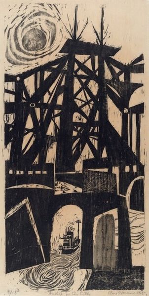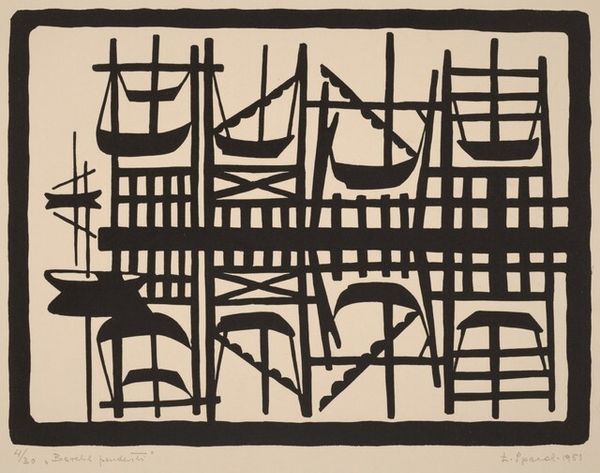 Curator: Welcome. Before us hangs Jacoba van Heemskerck's woodcut from 1915, entitled "Compositie no. 15." It’s currently held here at the Rijksmuseum. Editor: My initial response is that it looks like an explosion in a carpentry shop! These stark contrasts—the bold blacks and whites—they create such dynamic, fractured spaces. Almost a visual haiku made of architectural debris. Curator: Precisely. Consider the semiotics at play here. The work dismantles representational norms in favor of pure, geometric forms. We see the clear influence of Cubism with elements of Art Nouveau, where line and shape dictate the entire composition, inviting viewers to deconstruct and reassemble the image. Editor: Yeah, I feel the urge to start rearranging these shapes and forms, imagining a city rising from the ashes. I like that it’s a woodcut—the deliberate cuts and gouges in the block translate to such immediacy on the paper. There's a rawness, a sense of something being hewn, not just drawn. Curator: The materiality enhances the abstraction. Each precisely carved line serves as both structure and form, thus allowing the stark contrasts of light and shadow to generate tension, reflecting the unease of pre-war Europe at the time of creation. Editor: Absolutely, the way it all interlocks feels ominous, like looking into the cogs of a machine that's about to break down. But despite the angst, there's beauty, too. It's that weird fascination we have with destruction. Curator: And the reduction of visual information—the flattening of perspective—compels the viewer to engage more actively with the piece. To discern order in apparent chaos, thus providing some resolution. Editor: The composition has gotten me thinking a lot about how our memories can be fractured too, you know? Distorted like a reflection in broken glass, where only shards of the whole story remain visible. It’s quite effective. Curator: Indeed. Ultimately, van Heemskerck challenges us to not simply look, but to actively decode our visual reality and seek deeper connections within abstraction. Editor: It definitely sticks with you. These bold shapes, with the push and pull between them—it becomes a visual puzzle you want to spend more time unraveling. I am certain each person sees a new piece every time they engage.