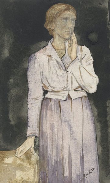 Editor: Here we have Egon Schiele's "Girl with Green Pinafore" from 1910, done in watercolor on paper. I’m immediately struck by the figure's almost painful shyness, and the way the sharp lines contrast with the delicate washes of color. How do you interpret the symbolism in this work? Curator: Schiele masterfully uses gesture to convey complex emotions. Notice the girl's hands obscuring her face. This speaks to a profound vulnerability, perhaps a societal suppression of youth and innocence during a time of great social upheaval in Vienna. Consider how the color green, often associated with life and growth, is juxtaposed with her withdrawn posture. Does it perhaps suggest a stifled potential? Editor: That's a fascinating point about the green. It does feel at odds with the figure’s posture. The awkward, almost angular pose seems so characteristic of Schiele. Curator: Indeed. The elongation and distortion of the figure aren't merely stylistic choices. They amplify the emotional intensity, hinting at inner turmoil and a discomfort within her own skin. Think about other symbols often linked to youth: a flower, a bird. Schiele strips away these idyllic images, instead presenting a rawer, more unsettling vision of adolescence. Editor: So, it’s less about representing reality and more about capturing a feeling, a psychological state? Curator: Precisely! And how do we read that white aura that surrounds the girl? Is that an afterimage of youthful vibrancy, the girl pushing outwards, or the condensation of her psychological angst, holding her in place? Editor: I hadn’t considered that it could represent both at the same time, so open to interpretation. Curator: The tension between the figure's external appearance and internal state makes this piece so compelling. A powerful expression of human experience through visual symbolism.