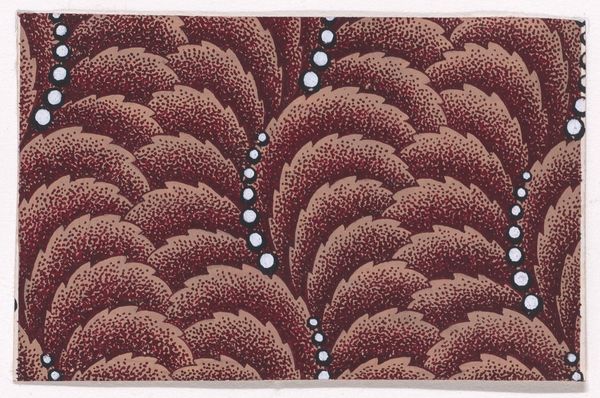 Editor: Here we have an anonymous textile design from 1840, currently housed at the Metropolitan Museum of Art. The materials used include drawing and print. What stands out to me are these overlapping scale-like shapes, broken up by vertical columns of white circles. How do you interpret this work? Curator: This design pulses with visual memory. The scales, that rhythmic repetition... Consider ancient armor, the scales of a serpent, or even the protective layers within us. Notice how they’re anchored by those stark, pearl-like circles set within geometric frames. The contrast between organic form and structured geometry is significant. Editor: Significant how? Curator: It's a play between chaos and order, perhaps reflective of the era itself. Early 19th-century design often grappled with these tensions as industrialization met romantic ideals. This anonymous artist is building upon long-held conventions that still resonate today. It is using forms that evoke subconscious links that can have power over culture. It almost recalls a uniform design, a suggestion of conformity through repetition. What are your thoughts about the colors used? Editor: It's interesting that the palette is quite limited, which underscores the shapes themselves. I do see a conversation of how humans strive to achieve order. It goes beyond simple repetition and more into a symbol of societal pressure, creating unique cultural impacts. Curator: Indeed! An artwork like this opens a window into both the aesthetic values and underlying anxieties of its time, continuing a tradition into modernity and raising more cultural continuity questions. Editor: I am leaving with an entirely new perspective on this pattern, having never thought of armor as a pattern of power and anxiety.