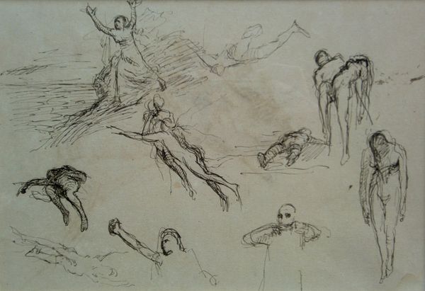 Editor: Here we have Lovis Corinth's "Trimalchio’s Funeral," a chaotic scene rendered in etching. It feels like a sardonic commentary. What’s your take on this piece? Curator: Considering Corinth’s era, this print can be viewed through the lens of social critique, questioning societal norms around death and mourning. Are we celebrating or mocking Trimalchio? The lack of clear lines blurs this distinction. Editor: So, the ambiguity itself becomes part of the statement? Curator: Exactly. It prompts us to question who benefits from spectacles of mourning and whose voices are silenced in these displays. Editor: I see it now; the print isn’t just a historical scene, but a challenge to power structures. Curator: Precisely! It seems Corinth intended for this piece to be provocative.