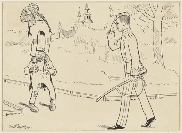 This small drawing, "En Soldat afgiver en Melding til sin Overordnede," was made by an anonymous artist using pen and ink. The technique of creating the drawing, with its reliance on line and hatching, shows a directness of execution. The artist would have had to be precise in their marks. The choice of pen and ink speaks to the function of this artwork, perhaps intended for reproduction in a newspaper or magazine. The material itself— humble, portable—suggests the conditions of the soldier's life, and perhaps the artist too. We might consider the class dimensions of this work; who had the luxury of oil paint, and who was left with ink? It's a modest image, but one that carries the weight of the military hierarchy.