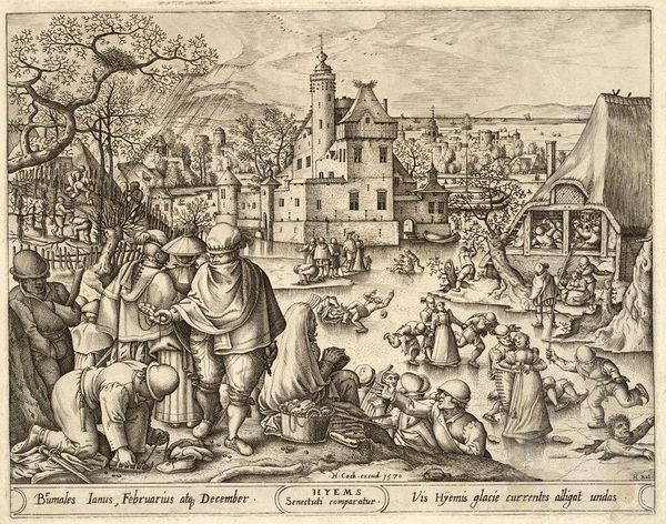 This is Julius Goltzius's "Herfst", or Autumn, made sometime between 1500 and 1595. Look closely, and you'll see a village bustling with the activities of the grape harvest. The print offers us a glimpse into the social and economic fabric of 16th-century rural life. Consider how gender roles are subtly depicted here. Predominantly men are shown undertaking the physical labor of harvesting and processing grapes. While women and children are present, their roles seem confined to domestic activities. The imagery reinforces a hierarchical structure, where labor and leisure are divided along class and gender lines. The artist provides a tableau that on the surface depicts a community united in its labor. But as the text at the bottom suggests, there is something more complex at play: "The rustic crowd feels that new gods are present". It prompts us to consider the shifts in cultural and spiritual beliefs during this era. What does it mean to witness a community caught between tradition and the winds of change? The artwork serves as a mirror, reflecting societal structures and the personal negotiations of identity within them.