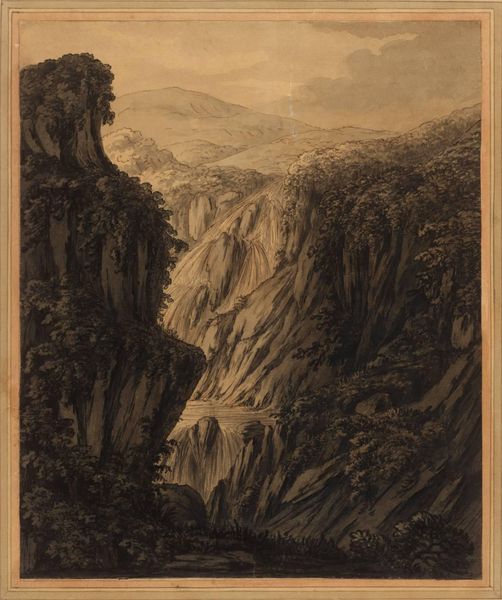Editor: This is Friedrich Wilhelm Gmelin's "The Grotto of Neptune with the Temple of Vesta and the Temple of Sybil at Tivoli." The cascading water and the towering structures create a really dramatic scene. What compositional elements stand out to you? Curator: The interplay between the organic forms of the landscape and the geometric precision of the architecture is particularly compelling. Observe how the verticality of the waterfall is echoed, yet contrasted, by the man-made structures atop the cliffs. Editor: I see that now! The composition directs my eyes upwards. Does this tension between nature and artifice suggest any specific interpretation? Curator: The artist's use of light and shadow to define form also creates a dynamic visual rhythm. Consider how the textures of the foliage contrast with the smooth surfaces of the temples. Editor: The level of detail is really impressive. I hadn’t noticed all of that before. Curator: Precisely. A close examination reveals the artist's mastery of form, line, and contrast, inviting deeper reflection on the work's intrinsic qualities.