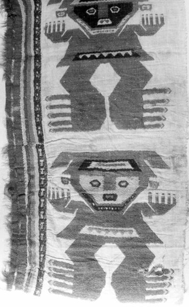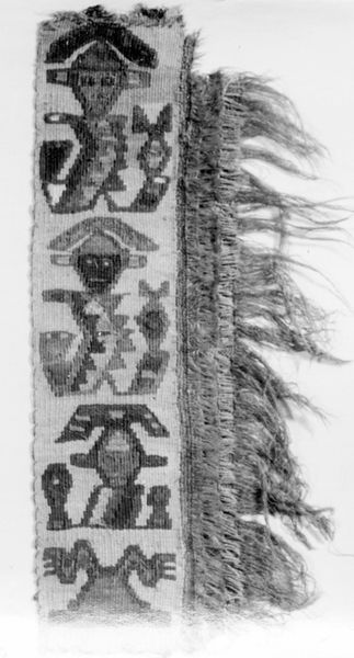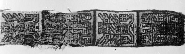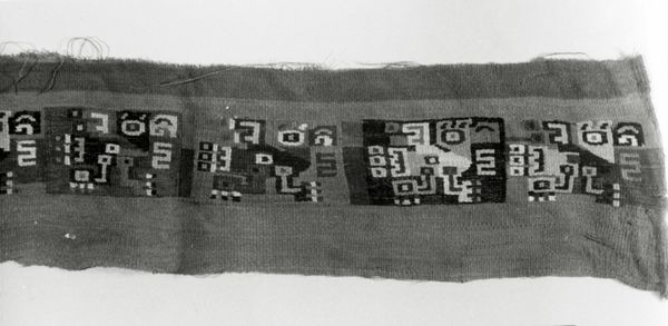 This textile fragment was created by the Moche people of ancient Peru. Existing between 200 and 850 AD, the Moche civilization thrived in a complex social hierarchy, where skilled artisans held a vital position. The Moche are renowned for their sophisticated textiles. Produced primarily by women, textiles were not merely decorative; they were integral to Moche culture, functioning as symbols of status, religious expression, and historical record-keeping. Textiles could also function as markers of ethnic identity. The central figure is likely a representation of a deity, possibly connected to agricultural fertility or power. The grid-like patterns on either side may represent cultivated fields, emphasizing the society's connection to the earth. It represents a worldview and belief system intrinsically tied to their environment and way of life. Consider how textiles like this provided a means of communicating complex ideas and beliefs within Moche society. Even now, despite its fragmentary state, the artwork carries echoes of a vibrant past.