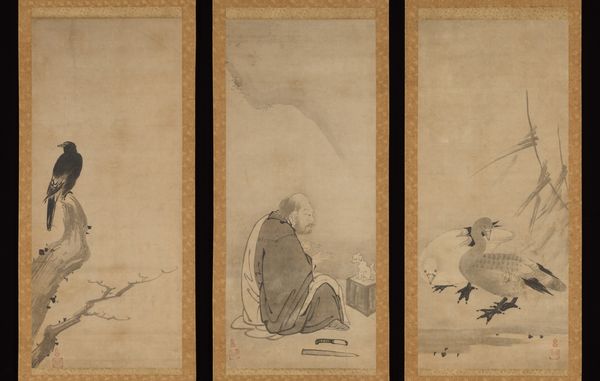 Here we see "Egrets and Crows," a work of art created by Shibata Zeshin. These two panel screens contrast sharply in tone and texture, offering a study in duality. On the right, two egrets, rendered in pale, soft hues, rest on a branch. The delicate lines and muted palette create a serene, almost ethereal atmosphere. In stark contrast, the left panel features crows depicted with bold, decisive strokes of black ink. Their dynamic poses capture the essence of movement and energy. Zeshin masterfully plays with positive and negative space. The solid forms of the crows are balanced by the emptiness of the gold background, drawing our eye to the birds' forms. The choice of birds is not accidental; they represent opposing symbolic worlds: one is grounded and assertive, the other is still and reserved. The contrast in color and form destabilizes any singular interpretation, suggesting an ongoing dialogue.