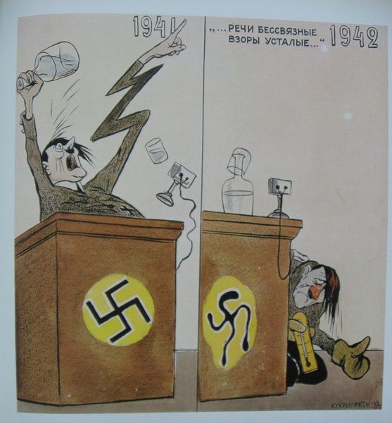 Curator: Ah, yes, this bold poster, "Two Pots (TASS Window № 1027)," comes to us from 1944, part of a series created by the Soviet artists known as Kukryniksy during World War II. It's a striking example of agitprop. Editor: Striking is…one word for it. My initial impression is one of stark contrast. A gloomy void above, and then this chaotic cauldron scene below, practically bubbling with miniature…are those Nazis being stirred like soup? Curator: Precisely! Kukryniksy used a piercing cartoon style. The “empty pot in Berlin” refers to Hitler's hollow ambitions. Note the rats scurrying around, hinting at decay. The lower scene… well, that’s the Russian pot near Minsk, where the Nazis are getting thoroughly cooked, depicted rather graphically if I may say. The red star is certainly…unmissable. Editor: The visual metaphors are blatant, bordering on the grotesque. But then, war isn’t subtle. This isn't high art trying to transcend conflict; it’s a propaganda weapon meant to inspire a very immediate emotional response. Does this piece tell us more about how the Soviet state wanted the war to be perceived than it does about the reality on the ground? Curator: Absolutely. It speaks to the Soviet public's resilience and resolve, but it also simplifies a complex geopolitical situation. The imagery aims for immediate comprehension, which is characteristic of poster art intended to bolster public morale. I also wonder if the sheer *stylization* – the cartoonish figures and exaggerated expressions – served as a form of psychological defense, a way to process immense trauma and turn it into something manageable, even laughable, on some level? Editor: Perhaps turning Nazis into figures of ridicule drained their perceived power? I keep coming back to that idea that the most successful war art, whether in paint or poetry, understands that to communicate the tragedy and stakes, that one must adopt and utilize symbols which speak clearly across demographics. Curator: In retrospect, pieces like these, they're more than mere artifacts; they serve as complex time capsules embodying those feelings that are all part and parcel of the human condition. Editor: Yes, it is indeed chilling to consider the complex story woven into this singular, graphic image, reminding us that this dark humor served a real-world purpose.