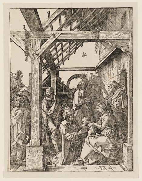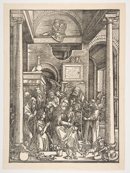Editor: Here we have Marcantonio Raimondi’s "Glorification of Mary," an engraving made sometime between 1510 and 1515. It’s incredibly detailed, almost overwhelming, with figures packed into the space. What's your take on it? Curator: Well, I immediately consider the socio-economic context of printmaking at the time. Raimondi was one of the first to commercially reproduce paintings; this engraving effectively democratized access to religious imagery. What effect do you think this might have had on the consumption of art? Editor: It’s fascinating to think about art becoming more accessible, but did that change how people valued the ‘original’ painting? Did it alter the perceived labor of the artist? Curator: Precisely! Consider the division of labor: Raimondi didn’t conceive the image; he reproduced it. He was, in essence, an artistic manufacturer. The market would shift with reproductive technologies, altering the value and function of art. Note the materiality; engravings such as these, widely accessible, are an artistic commodity reflecting economic transformation. Editor: I see your point. So it's not just about the religious narrative, but also about the process of making and distribution itself. It reframes the "Glorification" from a solely devotional object to a manufactured commodity. Curator: Exactly! We tend to overlook the physical creation and material conditions of older art, especially prints, to favor iconographic interpretations. These prints became an extension of the cultural and economic values of the time. Did the means of production somehow take agency from the artist? Is an artisan now just a craftsman? Editor: That gives me a whole new appreciation for prints! Thanks; that shifted my perspective quite a bit! Curator: Indeed! Examining the tools and trades of the period helps ground our understanding of both religious devotion and the economic engine driving artistic production.