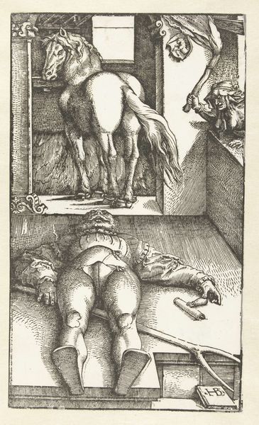 Curator: Right now we’re looking at a pen and ink drawing called “Mars, Venus Holding a Pear, and a Child” by Melchior Lorck, created around 1569. What catches your eye first about this tableau? Editor: It’s so odd! The exaggerated lines, the almost grotesque figures, give off such a bizarre, slightly unsettling energy. It’s beautiful, but not classically so. Curator: Absolutely. Lorck was a master of Mannerism, known for its artificiality and exaggeration. Venus is lounging, completely nude, presenting a pear to a child, likely Cupid. In the corner, a furious Mars descends on a cloud, brandishing a what seems a drapery rod as though it were a sword! Editor: That pear is really fascinating. A symbol of Venus, sure, representing her sensuality, but offering it to Cupid...is it like nurturing desire? Or the power of beauty and love as the ultimate goal, with Venus handing it over to the next generation of passion? Curator: It’s interesting you see the pear as being handed over! I tend to understand it as an instrument to corrupt and to distract. Mars’ drapery-rod weapon would imply that he’s about to disrupt the game! After all, it's an adulterous affair, hidden by Venus's drape turned canopy. Editor: I can get that reading. Lorck certainly gives an expression to Mars suggesting a violent act. It all reads so symbolic! Like it’s coded for multiple readings and different interpretations, I feel there's some esoteric dimension I'm simply missing. The ink strokes lend this kind of ethereal yet very textured, tangible feeling, as well. The lines are so decisive, unforgiving almost, with that frenetic hatching implying the density of the dramatic scene! Curator: Lorck's penmanship is absolutely confident. This piece, steeped in allegory, seems to want us to reflect on conflict between love, desire, and violence – with perhaps a subtle warning baked into the beautiful, complex linework. Editor: Absolutely. I am walking away from this piece filled with questions... Lorck presents such strange visual conundrums with his assured and almost brutal technique, and somehow manages to leave me even more lost than when I came in!
