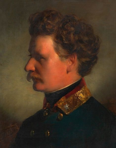 Curator: Here we have Hans Canon’s “Karl Ludwig Freiherr von Schönermark,” painted around 1865. Editor: What strikes me immediately is the crispness of the white uniform against that shadowy background; it gives such weight and presence to the figure. You really see the weave and texture. Curator: Absolutely. And it’s worth considering the significance of these formal portraits during the 19th century. Beyond mere likeness, these images project power and legitimize hierarchies of gender, race, and class, wouldn't you say? The sitter's very pose is meant to convey authority. Editor: Precisely! Canon is using the classic vocabulary of power; those glimmering buttons, that intricate gold braid, the carefully arranged medals—they speak to the meticulousness of creating the impression of wealth and control. I wonder about the cost of the materials here and the workshops where they were manufactured? Curator: Well, the choice to depict Freiherr von Schönermark with these signifiers of nobility says volumes. But consider what those medals signify, what political actions and alliances might they represent? Who did Canon expect would be viewing this portrait and what messages were encoded for them? Editor: And also, think about the canvas, the paints themselves, how the very materials contributed to reinforcing the subject's importance. The weight of the frame is part of it all. What type of workshops fabricated the canvases he would have been working on? Curator: Yes! Canon uses those readily available materials to perpetuate the very ideologies that give meaning to the aristocracy’s visual presentation. We’re seeing how systems of belief get physically rendered in oil on canvas. It's interesting how artists like Canon play a vital role in maintaining these visual tropes. Editor: Thinking about process here, do you consider the impact of mass production on how uniforms and these symbols of wealth and class were made? Canon may have been elevating the Baron, but what does his painting tells us about a burgeoning industrialized economy propping up an older regime? Curator: I find myself pondering Canon’s role, almost as an illustrator. By depicting Freiherr von Schönermark, he reinforces this idealized, romanticized view of aristocracy, while, simultaneously maybe undermining traditional aristocratic visual language with readily available industrial methods. Editor: Ultimately, the image prompts us to question how authority and prestige are constructed. Curator: Agreed, and whose stories get told and retold through art history, solidifying certain power structures, intentionally or not.