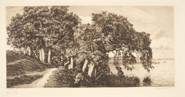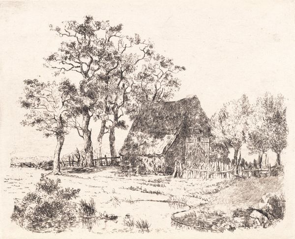 Curator: This is Niels Skovgaard’s 1883 etching, "Bondegård i Nestelsø," or "Farm in Nestelsø." The crisp lines give it a wonderfully detailed texture. What stands out to you at first glance? Editor: It has a somewhat melancholic, quiet feeling. Stark black and white imagery and dense lines suggest a simple and humble existence. Curator: Skovgaard's choice to create this landscape as a print is quite interesting, as realism, in painting especially, was increasingly becoming a dominant style for communicating objective truth about the human condition. How does this landscape further those pursuits? Editor: The way he emphasizes everyday details—the chickens pecking, the texture of the thatched roofs and haystacks, all those little details. I see echoes of traditional rural life; haystacks remind me of shelter, but perhaps Skovgaard means something beyond just surface portrayal. Curator: Certainly! He's inviting us to connect to this cultural memory. The stark contrasts create such striking patterns, but what do the arrangements suggest to you? Editor: The scene's not picturesque. The composition feels weighted toward the left, and the whole image conveys a sense of unsentimental rural life, right? These are solid, perhaps unremarkable people who toil everyday within their landscapes, their community—their sense of place. I suppose the art asks us to think about their perspective, about their belonging. Curator: And in the Danish Golden Age, which really championed a strong national identity and folk awareness, it's important that the landscape have specific characteristics, to allow it to feel distinctly "Danish". Does this image present symbols unique to this kind of landscape? Editor: Maybe those chickens; it seems the Danish peasantry in general kept chickens! But seriously, though, the thatched roofing would perhaps serve as a stronger identifier—a visual anchor associated with certain landscapes or cultures—establishing Denmark in this case. Curator: Well, "Farm in Nestelsø" gives us so much to reflect on, regarding themes of homeland, everyday realities, and cultural values. Editor: Yes, Skovgaard's eye really asks us to rethink our connections between people and place and consider how this bond forms collective identities, and realities.